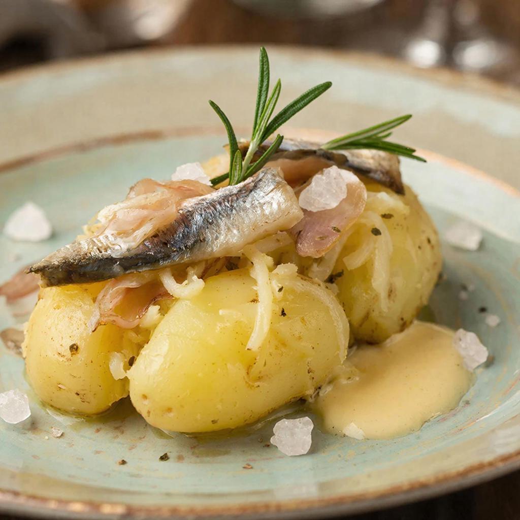 Маленькие картофелины, аккуратно сваренные до идеальной мягкости, затем обжарены в душистом масле с веточками свежего розмарина, придающими тонкий хвойный аромат. К ним добавляется деликатесная слабосоленая сельдь холодного копчения, нарезанная тонкими ломтиками, гармонично сочетаясь с пикантностью картошки и сливочного масла.