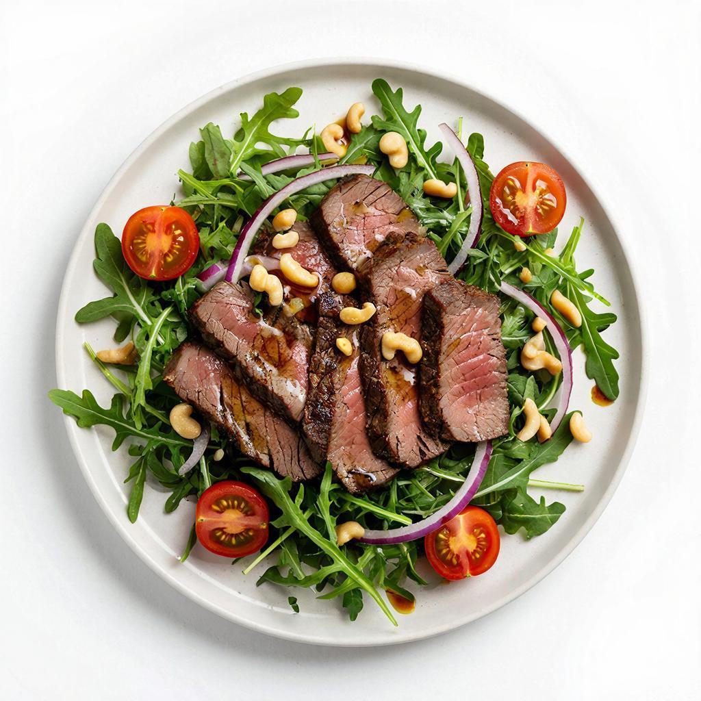 Свежая рукола, слегка горчащая и освежающая, дополненная тонкой нарезкой ароматного ростбифа, выдержанного до идеальной степени прожарки. Салат украшен дольками помидоров черри, зернами граната и посыпан кедровыми орешками. Заправлен легким бальзамическим уксусом и качественным оливковым маслом первого отжима. Нежный вкус мяса подчеркивает свежесть зелени, создавая гармоничное сочетание вкусов и текстур.