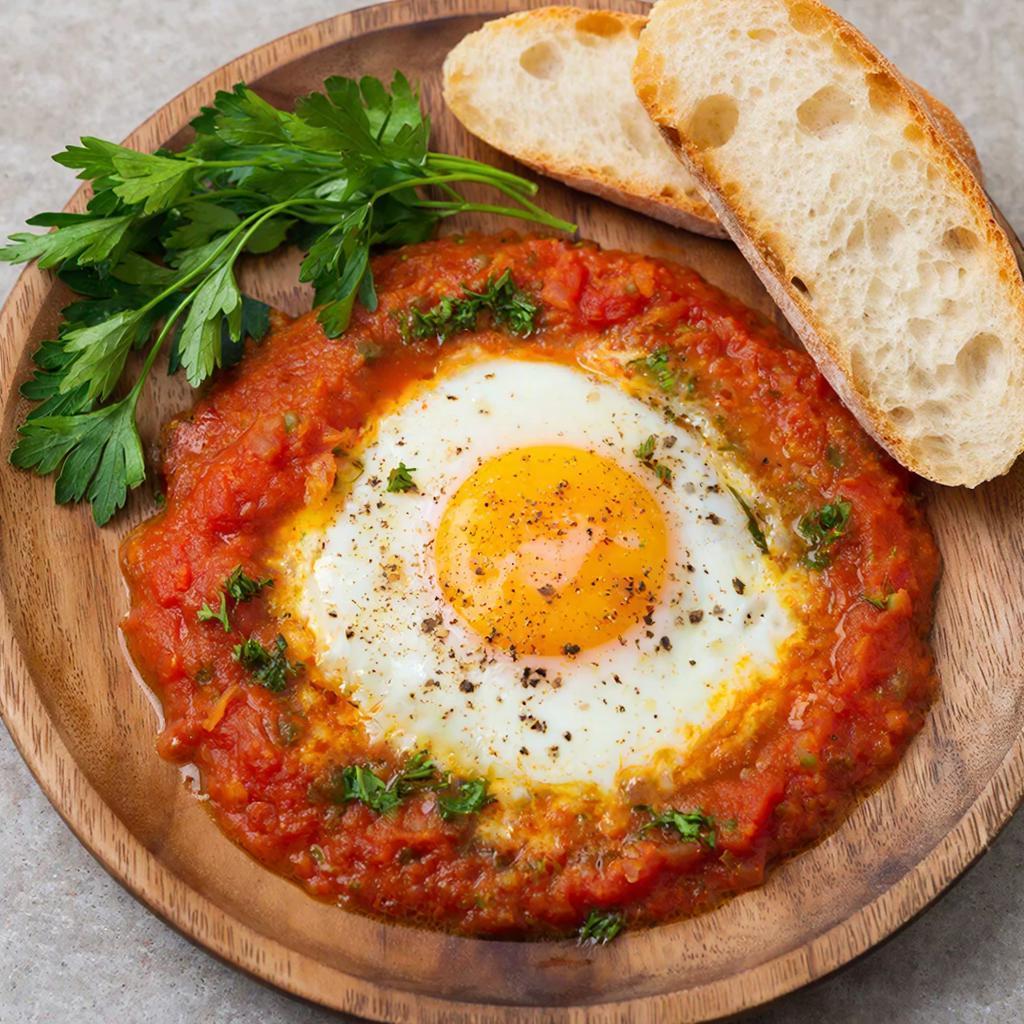 Традиционное блюдо средиземноморской кухни, представляющее собой ароматную яичницу, приготовленную в пряном томатном соусе с добавлением болгарского перца, лука и специй. Нежные яйца запекаются прямо в густой соус, создавая неповторимую игру вкусов и текстур. Шакшука идеально подходит для завтраков, ужинов и даже перекусов, прекрасно сочетаясь с хлебом, лепешками или свежими овощами.
