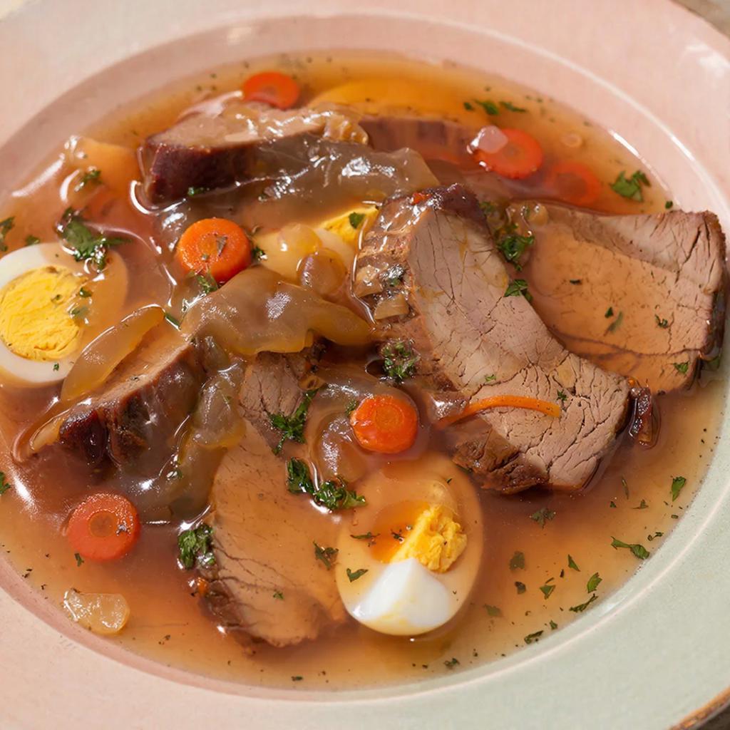 Нежнейший отварной говяжий язык, бережно приготовленный по традиционному рецепту и покрытый прозрачным ароматом трав желе. Украсит любое праздничное застолье своим изысканным вкусом и эстетичным внешним видом. Прекрасно сочетается с зеленью, маринованными овощами и легкими соусами.